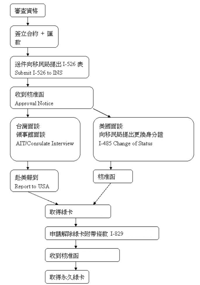 - 拿到有條件綠卡21個月後,向美國移民局提出申請I-829,解除條件,取得永久綠卡